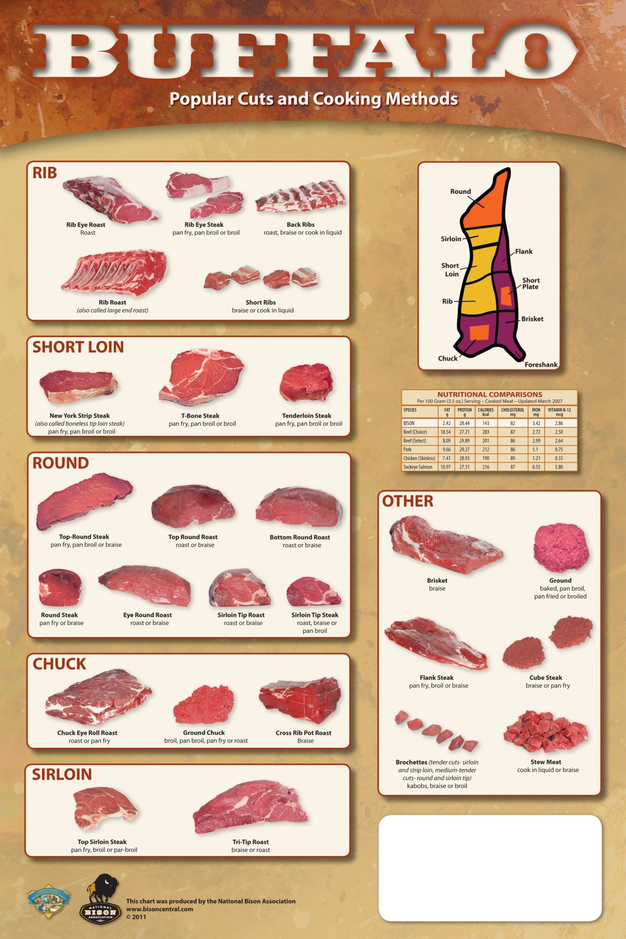 Bison are processed and cut a little different than beef for a variety of reasons. Bison have an extra rib and you cannot get a hump roast off a beef cow. From the processed meat, about 17% will be steaks, 55% will be ground bison, 25% will be roasts (which can also be ground stew meat if roasts are not desired), and 3% will be other (short ribs and ox tail).